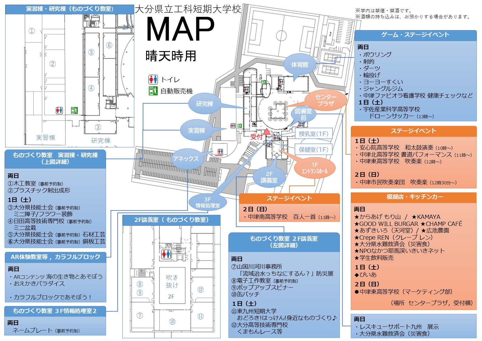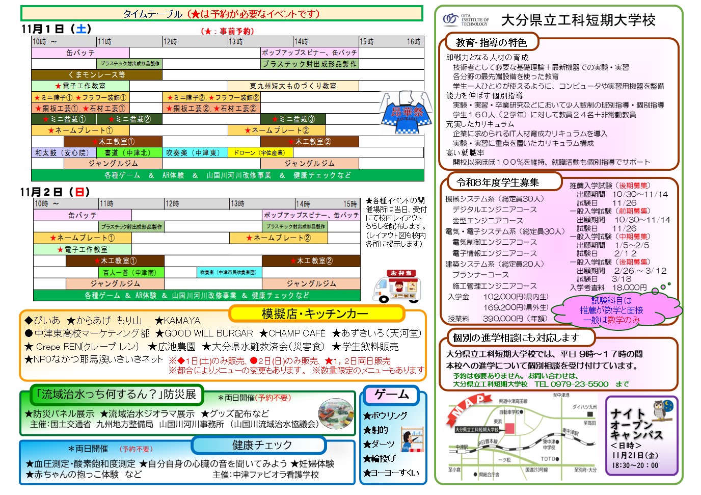 - 11月1日,2日両日出店:からあげ もり山、KAMAYA、GOOD WILL BURGER、CHAMP CAFÉ、あずきいろ(天河堂)、Crepe REN、広池農園、大分県水難救済会(災害食)、NPOなかつ耶馬渓いきいきネット、学生飲料販売