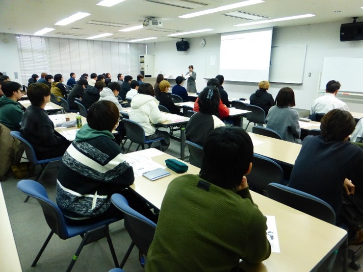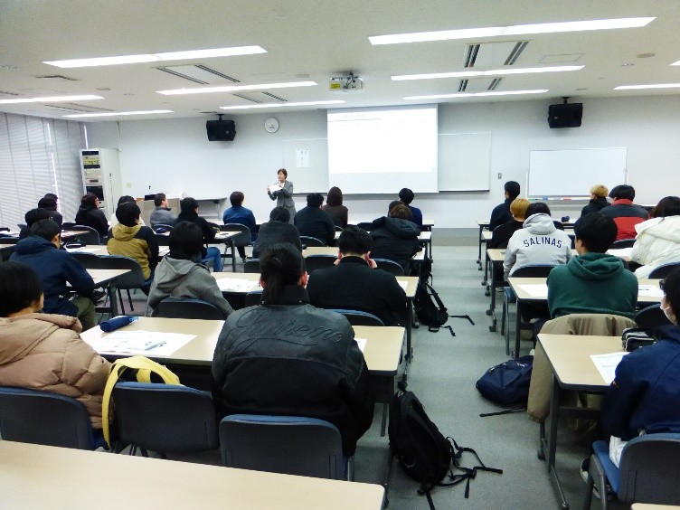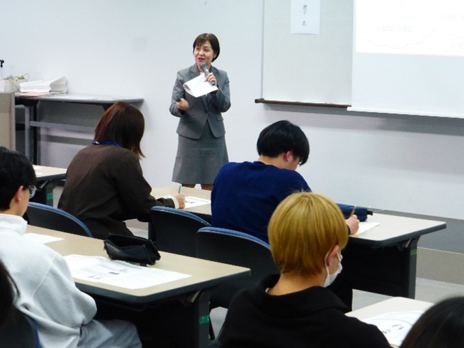 先生から社会人の身だしなみや態度、名刺交換、職場でのコミュニケーションの取り方、就職後の相談先など、演習を交えた講義がありました。 学生から「就職後、仕事を頼まれた際に5W1Hで聞き返すことや、心の中だけで考えるのではなく、声に出すことが大切。社内での信頼関係づくりには、雑談など様々な方法があることが分かった。」などの感想がありました。