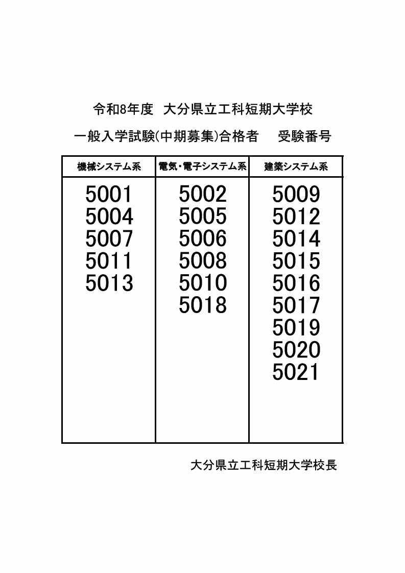 令和8年度 一般入試中期募集 入学試験合格者